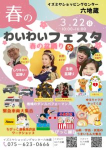 盆踊り.jp ホーム お問い合せ 新規メンバー登録 メンバーログイン 盆踊り情報登録フォーム 盆踊りの開催情報まとめ みんなで楽しく踊ろう! 京都府の盆踊り 滋賀県の盆踊り 大阪府の盆踊り 奈良県の盆踊り 情報収集中!お問い合せよりご連絡下さい イズミヤSC六地蔵 春のわいわいフェスタ2026 春の盆踊り 日時 2026.03.22(日) 10:00~16:00 会場 イズミヤショッピングセンター六地蔵 タグ 京都市 / 伏見区 / 駅近